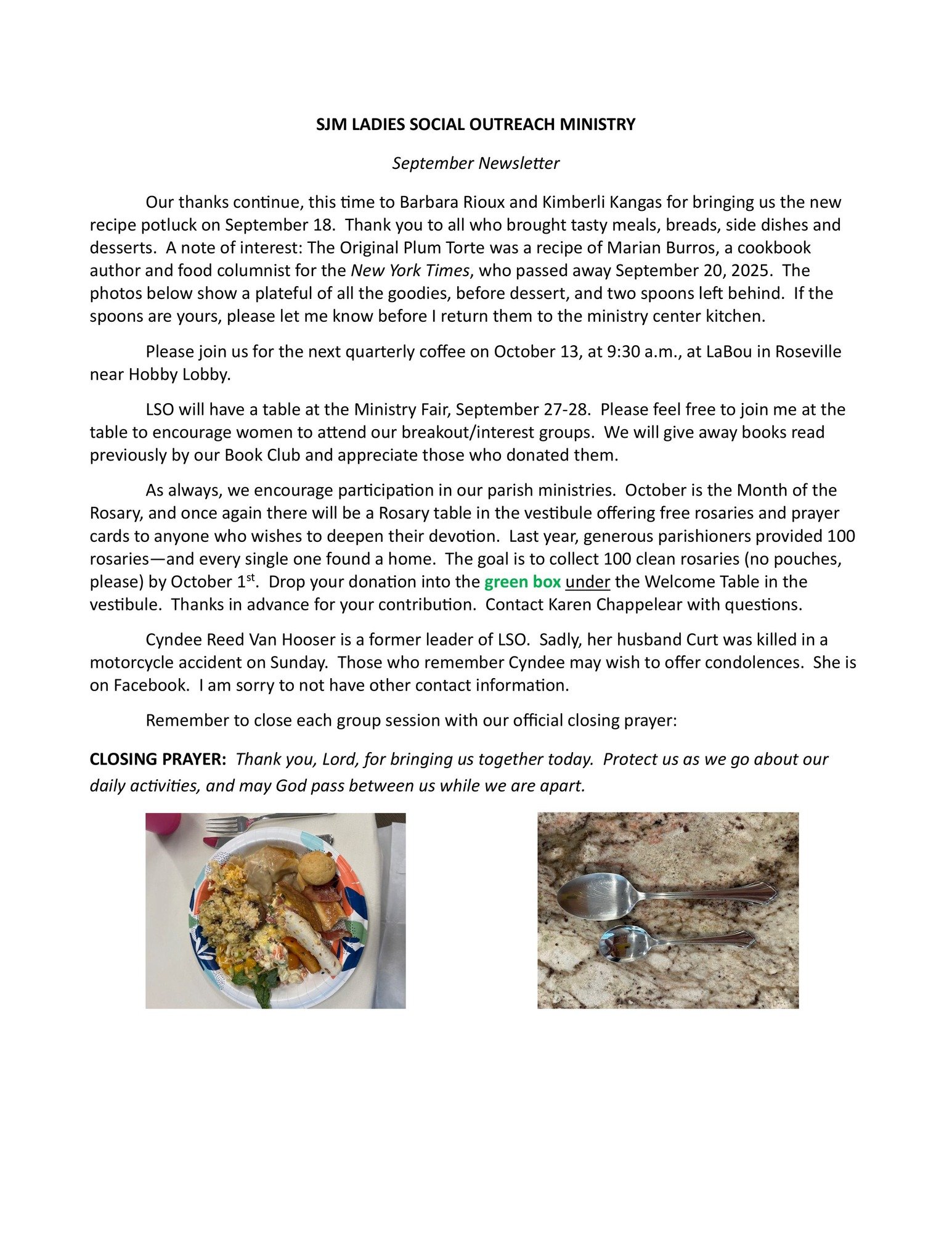 LSO was founded in 2004 to promote social interaction among the women of our Parish community in the spirit of Mary and Martha, Friends of Jesus.